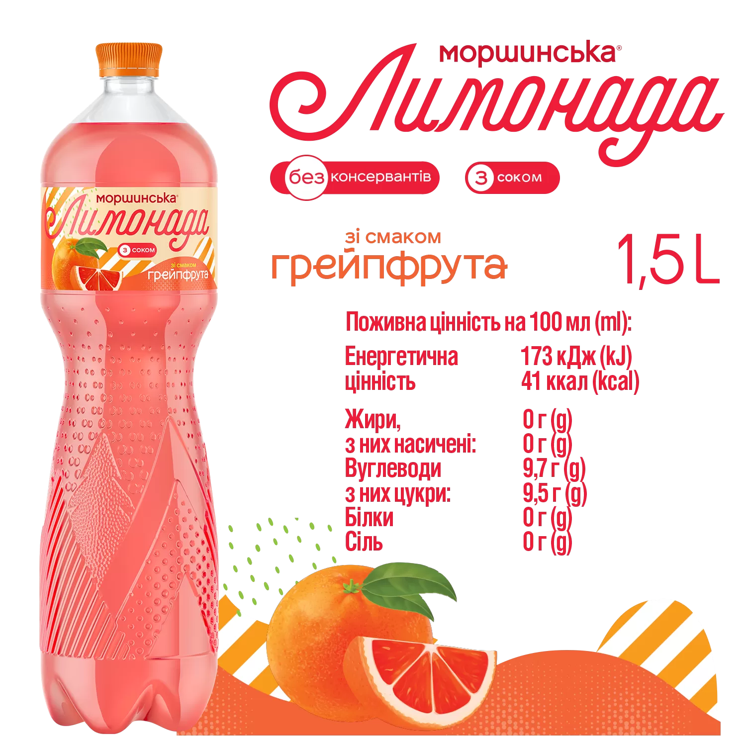 Моршинська Лимонада зі смаком грейпфрута — на основі природної мінеральної Моршинської з додаванням соку освіжаючих грейпфрутів.