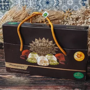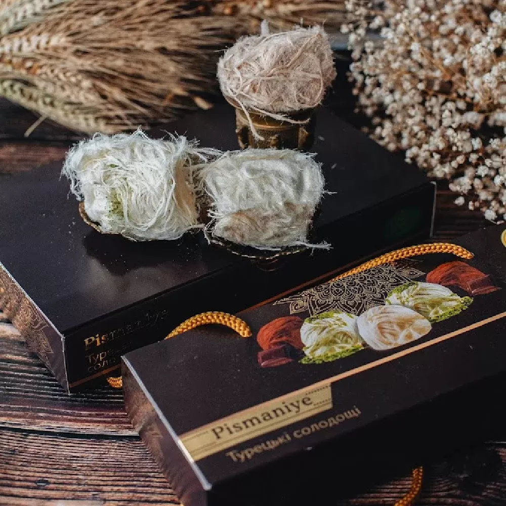 Це вишуканий східний десерт, який здивує ніжною текстурою і неперевершеним смаком. Цей подарунковий набір об'єднує три різновиди пішманії, кожна з яких має унікальний смак і вигляд. Пішманія, відома як "солодка вата зі смаком халви", виготовляється з тонких ниток карамелізованого цукру та борошна, що створює легку, пухку структуру, яка тане в роті. Набір стане чудовим подарунком для любителів східних солодощів або ж елегантним частуванням на святковому столі. Особливості набору: Три різних види пішманії з оригінальними смаками. Ніжна текстура, що тане в роті. Підходить як для особистого вжитку, так і для подарунка. 1.