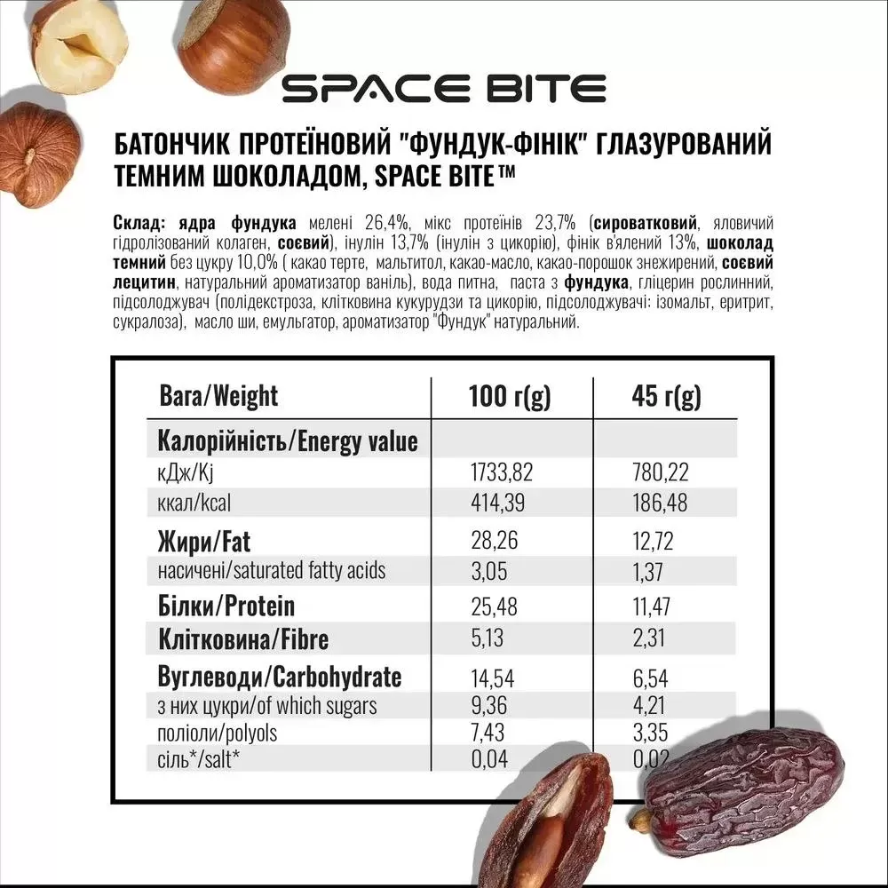 Space Bite «Фундук-Фінік» — це функціональний протеїновий батончик, що поєднує в собі насичений смак горіхової пасти, солодкість натурального фініка та професійний протеїновий комплекс.