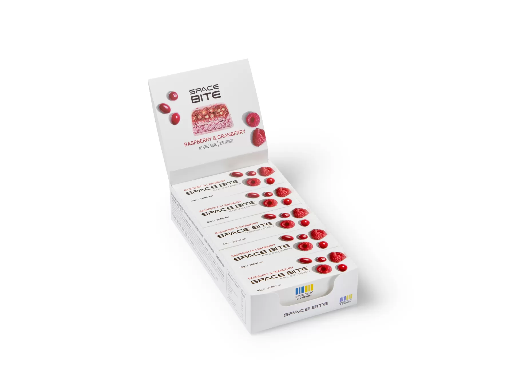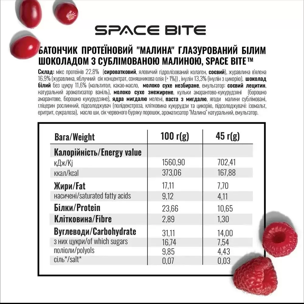 - Смак та текстура: Батончик вкритий білим бельгійським шоколадом та прикрашений сублімованою малиною, що додає приємної ягідної кислинки.