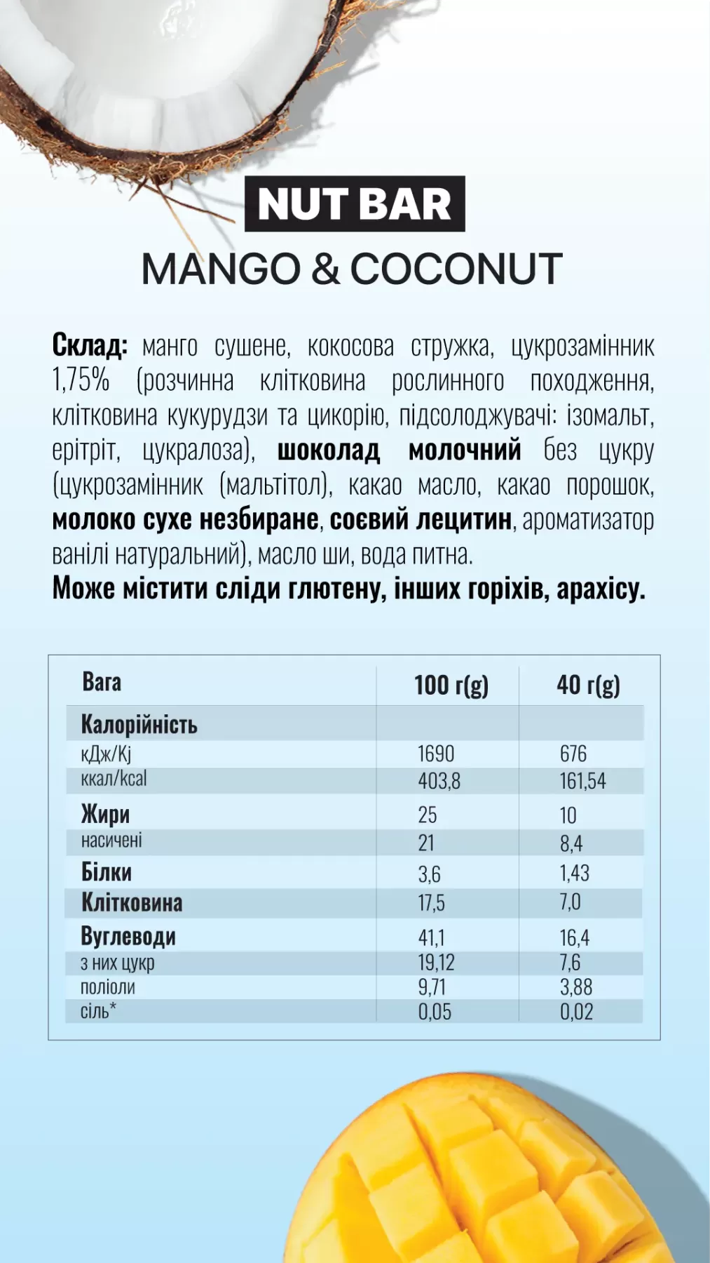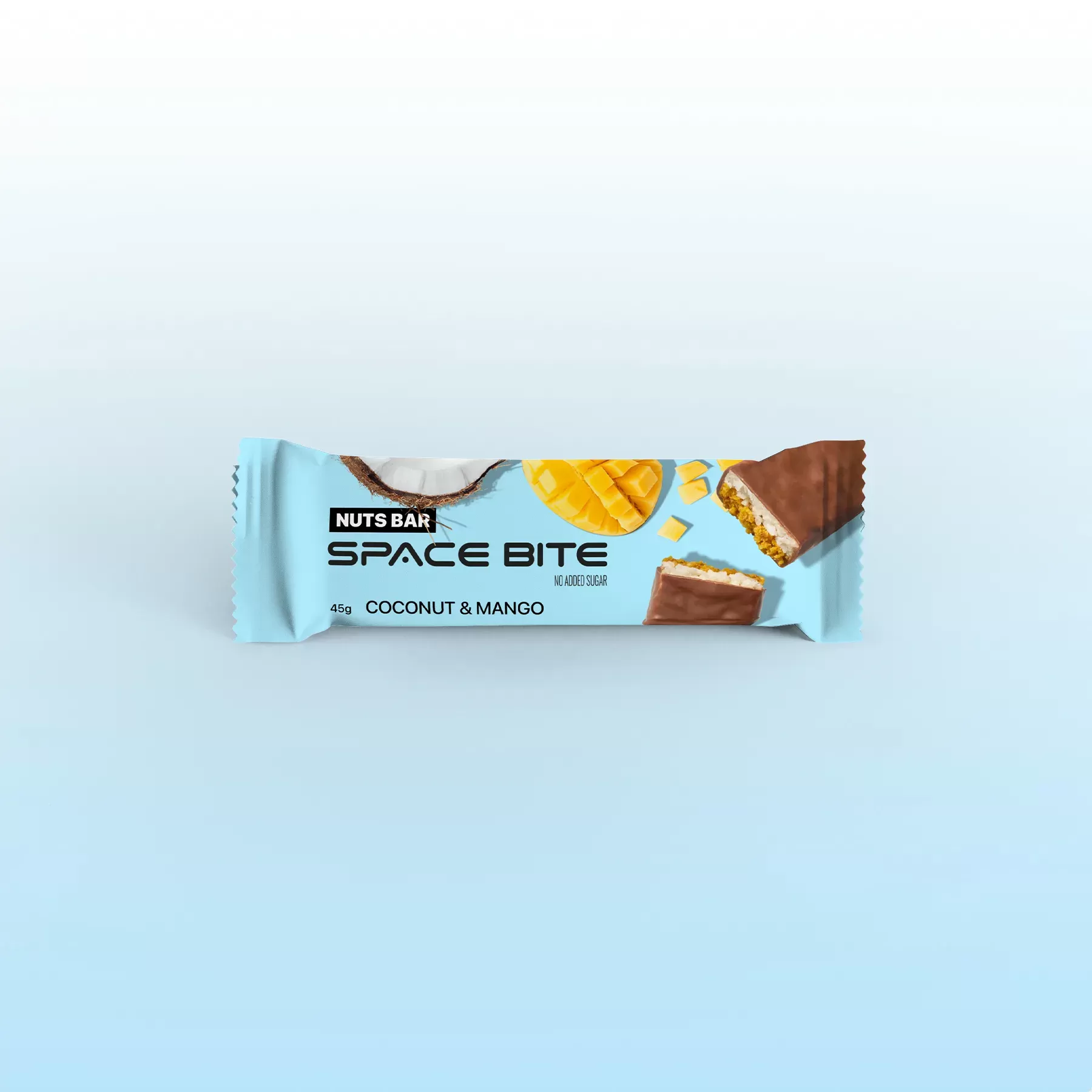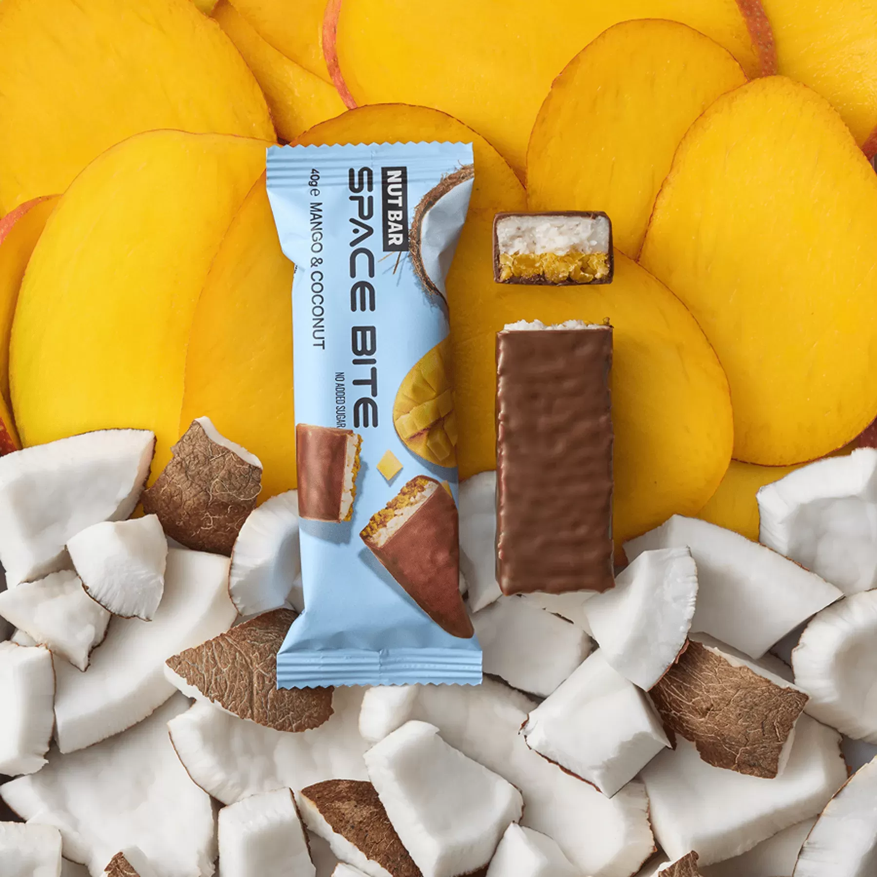 Енергетичний батончик із в’яленим манго та кокосовою стружкою, вкритий ніжним молочним шоколадом - це натуральний перекус українського виробництва (Space Food), що поєднує смак в'яленого манго та кокосової стружки під шаром молочного шоколаду без цукру.