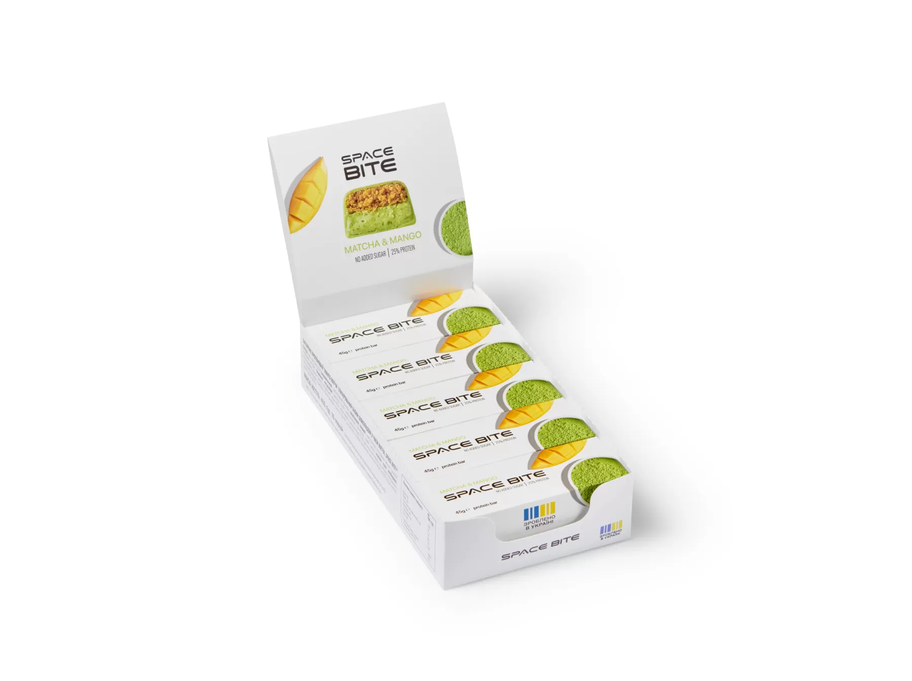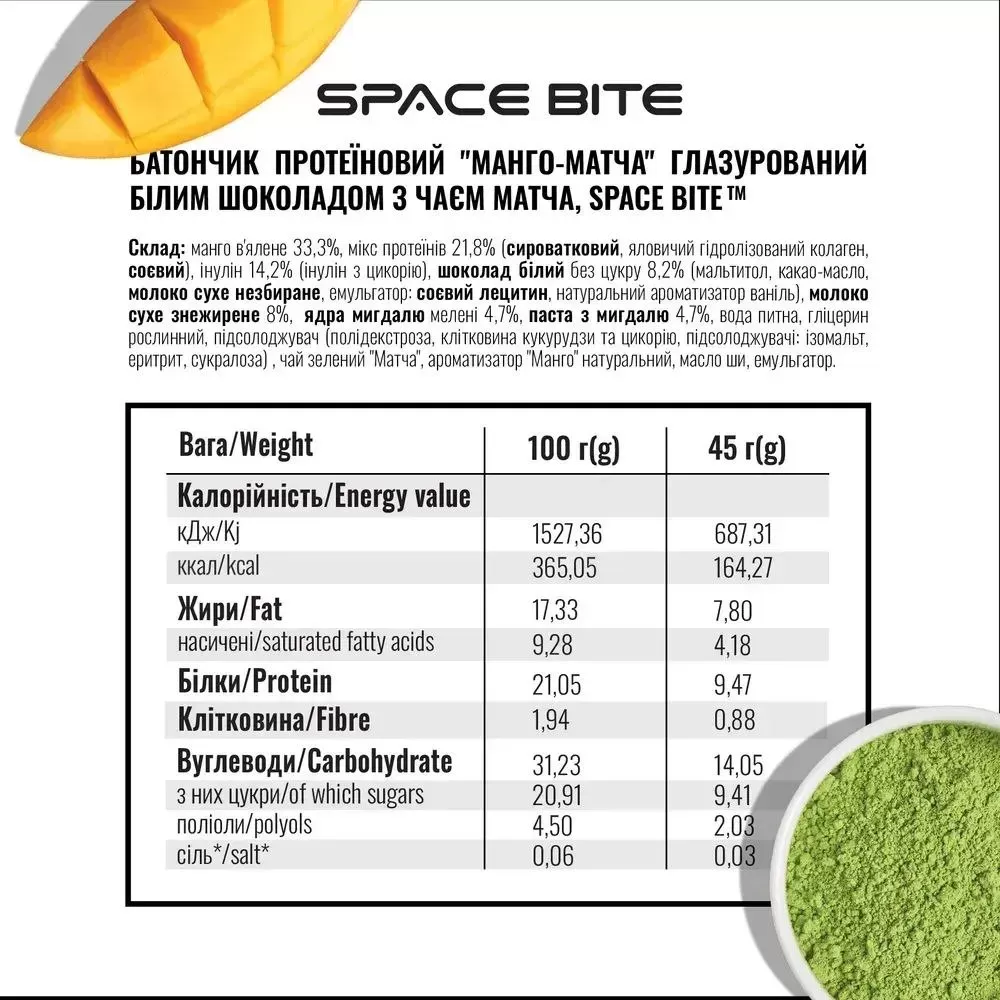 Батончик Space Bite «Матча-Манго» — це функціональний десерт, який поєднує користь суперфудів і смак тропіків. Його часто обирають як здорову альтернативу звичайним солодощам. Основа батончика — м’яка протеїнова маса з мигдалевим борошном та шматочками в’яленого манго. Зверху він покритий тонким шаром ніжного білого шоколаду (на основі замінника цукру). На смак батончик не надто солодкий. Виражена трав'яниста свіжість японського чаю матча збалансована кислинкою та ароматом натурального манго.