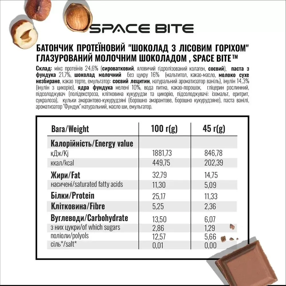 Бренд Space Food робить акцент на "чистому" складі: у батончику немає трансжирів, пальмової олії та зайвих штучних консервантів. Це робить його одним із найбільш збалансованих варіантів у сегменті українських протеїнових солодощів.