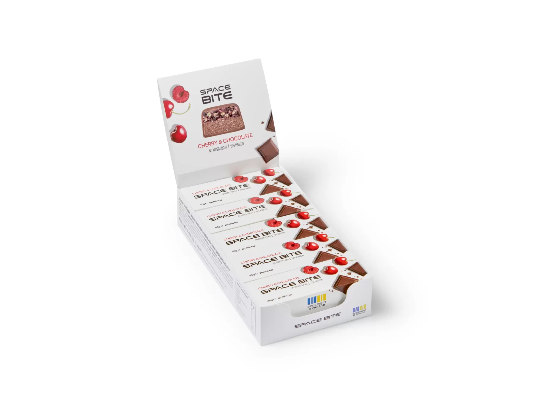 Протеїновий батончик Space Bite "Вишня з шоколадом" — це натуральний перекус українського виробництва, що поєднує смак в'яленої вишні та темного бельгійського шоколаду без додавання цукру. Це не просто протеїновий батончик, а корисний десерт зі структурою, що нагадує цукерку.
