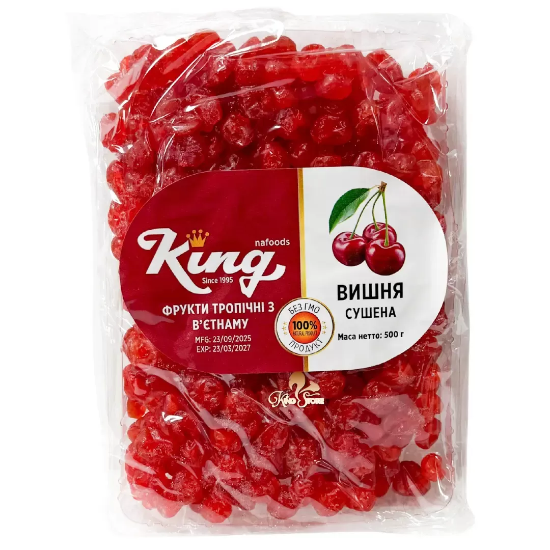 Вишня в'ялена King (ціла ягода) — це натуральний сухофрукт преміальної якості, виготовлений із добірних плодів без кісточки. Завдяки технології дбайливого в'ялення, ягода зберігає свою форму, м'ясисту текстуру та глибокий бордовий колір.