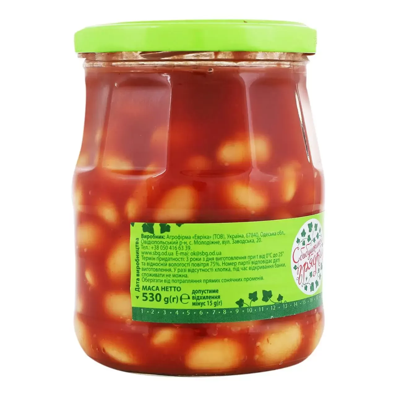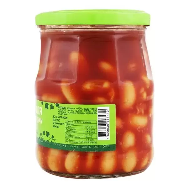 Склад: Квасоля -62%, вода питна, томатна паста, цукор білий, сіль кухонна харчова, перець червоний мелений