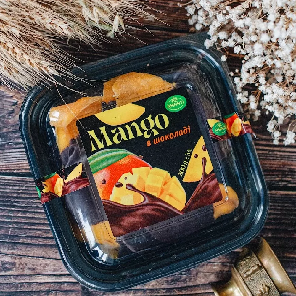 Склад: манго сушене, шоколадне покриття (цукор, какао-масло, какао-порошок, емульгатор — соєвий лецитин, натуральні ароматизатори).